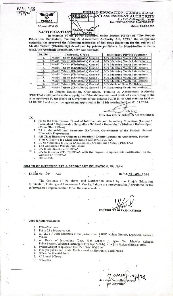 PECTAA: Notification Regarding TextBooks for Religious Education