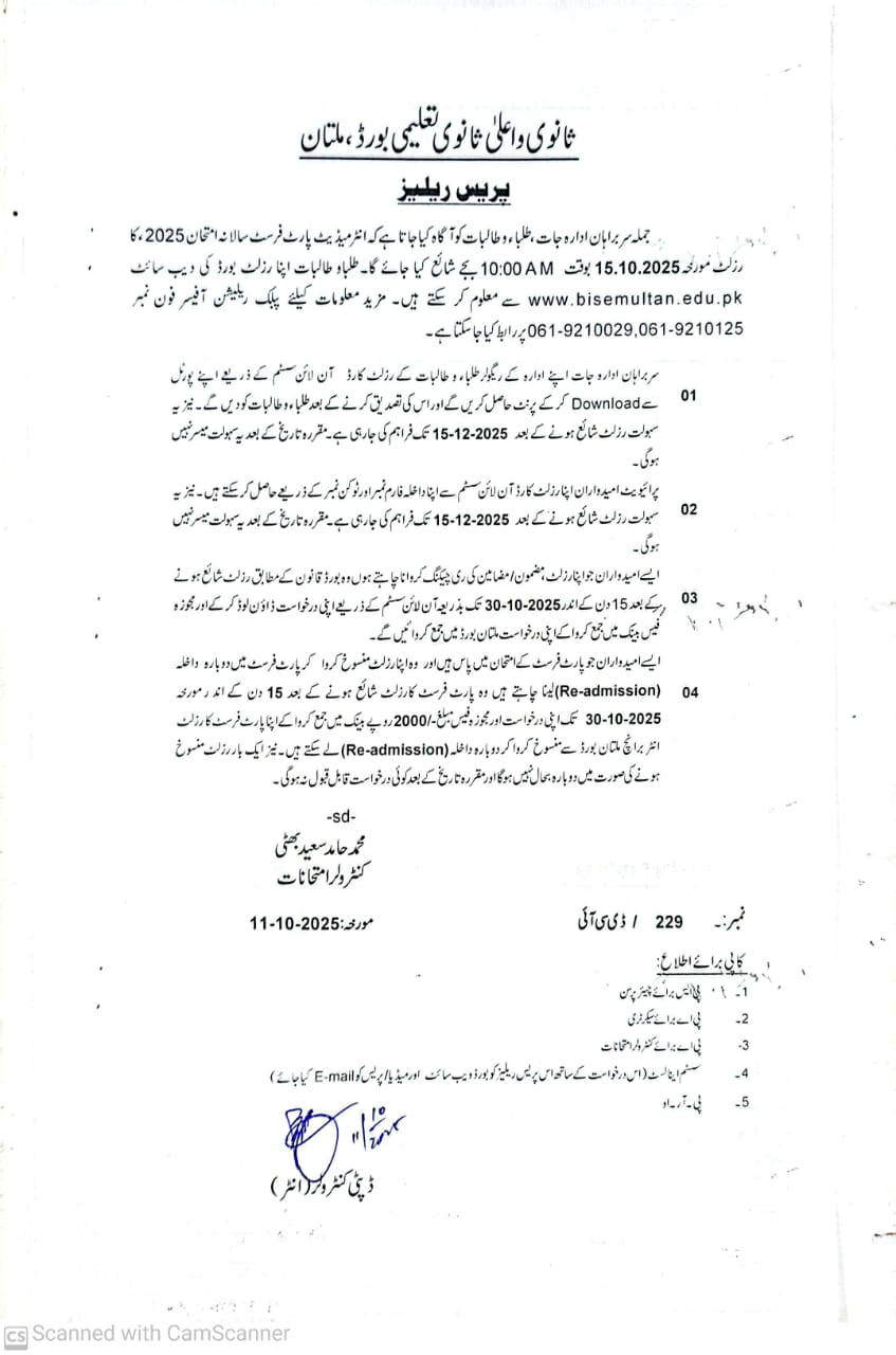 News, Press Release Press Release Regarding Declaration of Result HSSC PART-I (11th ) 1st Annual Examination 2025