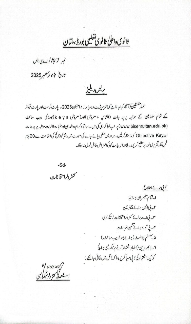 News, Press Release Press Release Regarding Question Paper with Answer Key of HSSC Part-I and Part-II 2nd Annual Examination 2025