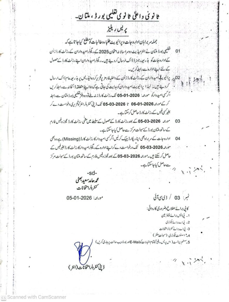 Press Release Regarding Result Card of HSSC 2nd Annual 2025