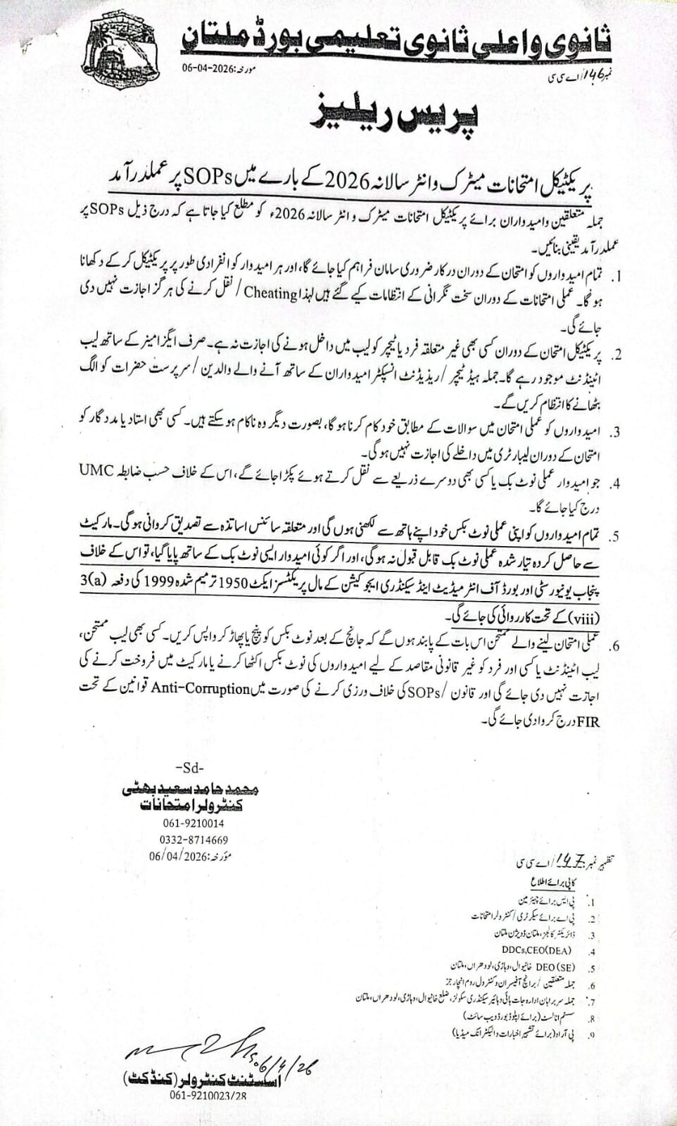 Press Release Regarding SOPs for Practical Examinations – SSC 1st Annual 2026