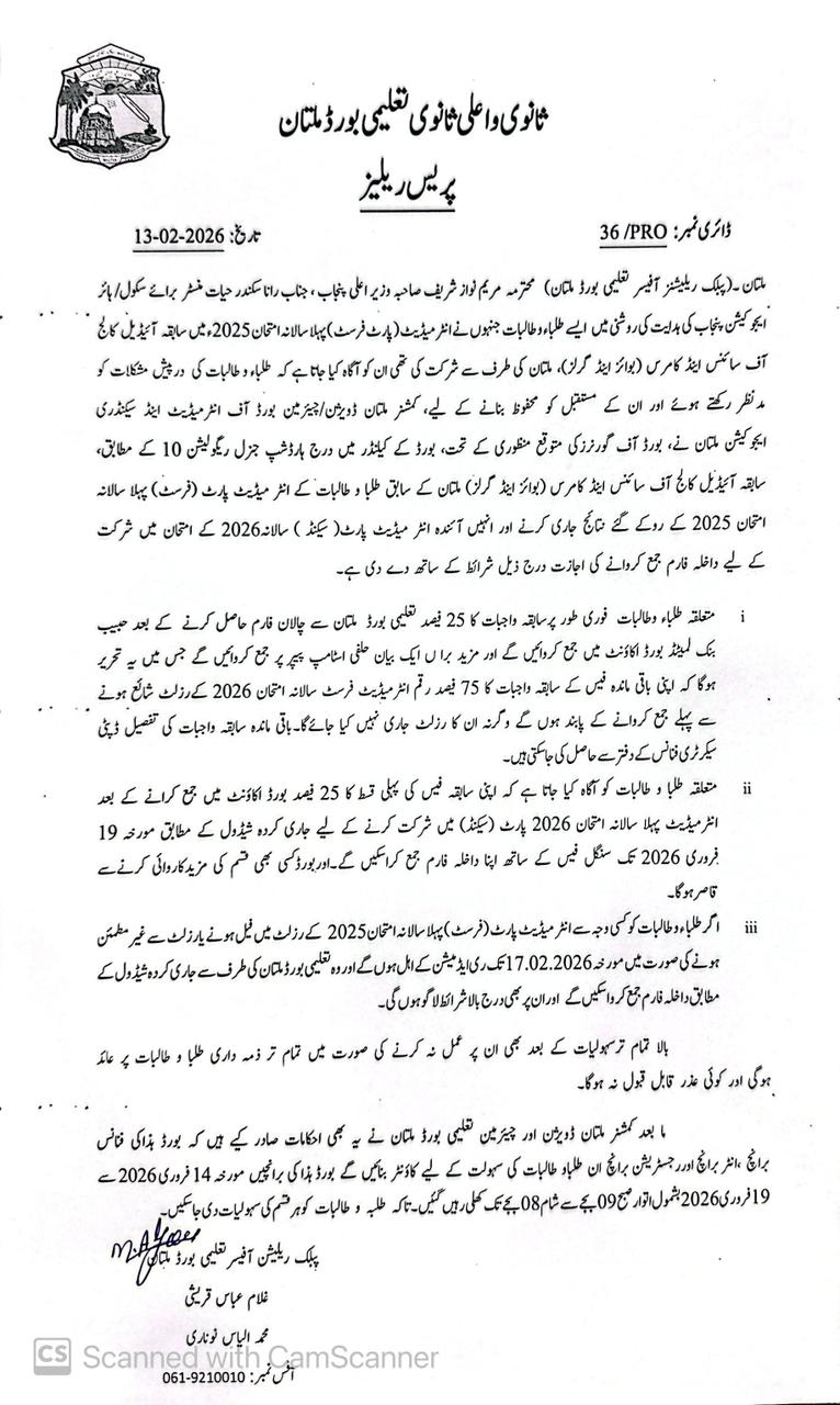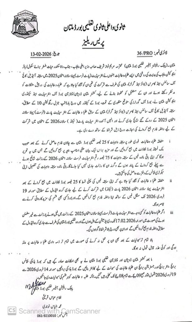 News, Press Release Press Release Regarding Submission of Admission Forms for HSSC First Annual Examinations 2026 for Candidates of Ex-Ideal College of Science and Commerce (Boys & Girls) Multan